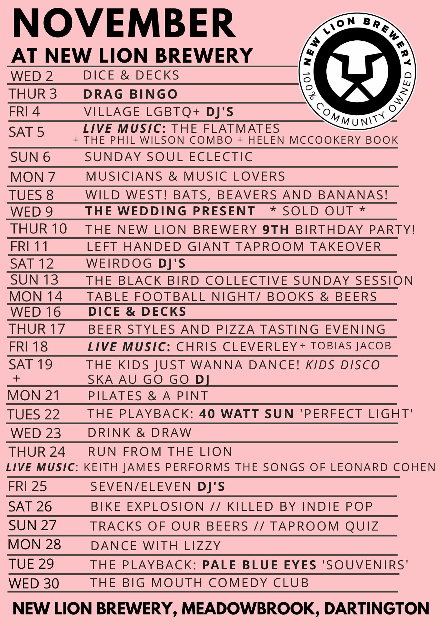 Our November events at the taproom feature beer tastings, taproom takeovers, DJ sets and live music from Chris Cleverley, The Flatmates and Kieth James, live comedy from Big Mouth Comedy Club, album playbacks from Pale Blue Eyes and 40 Watt Sun, and the return of all of our regular events!